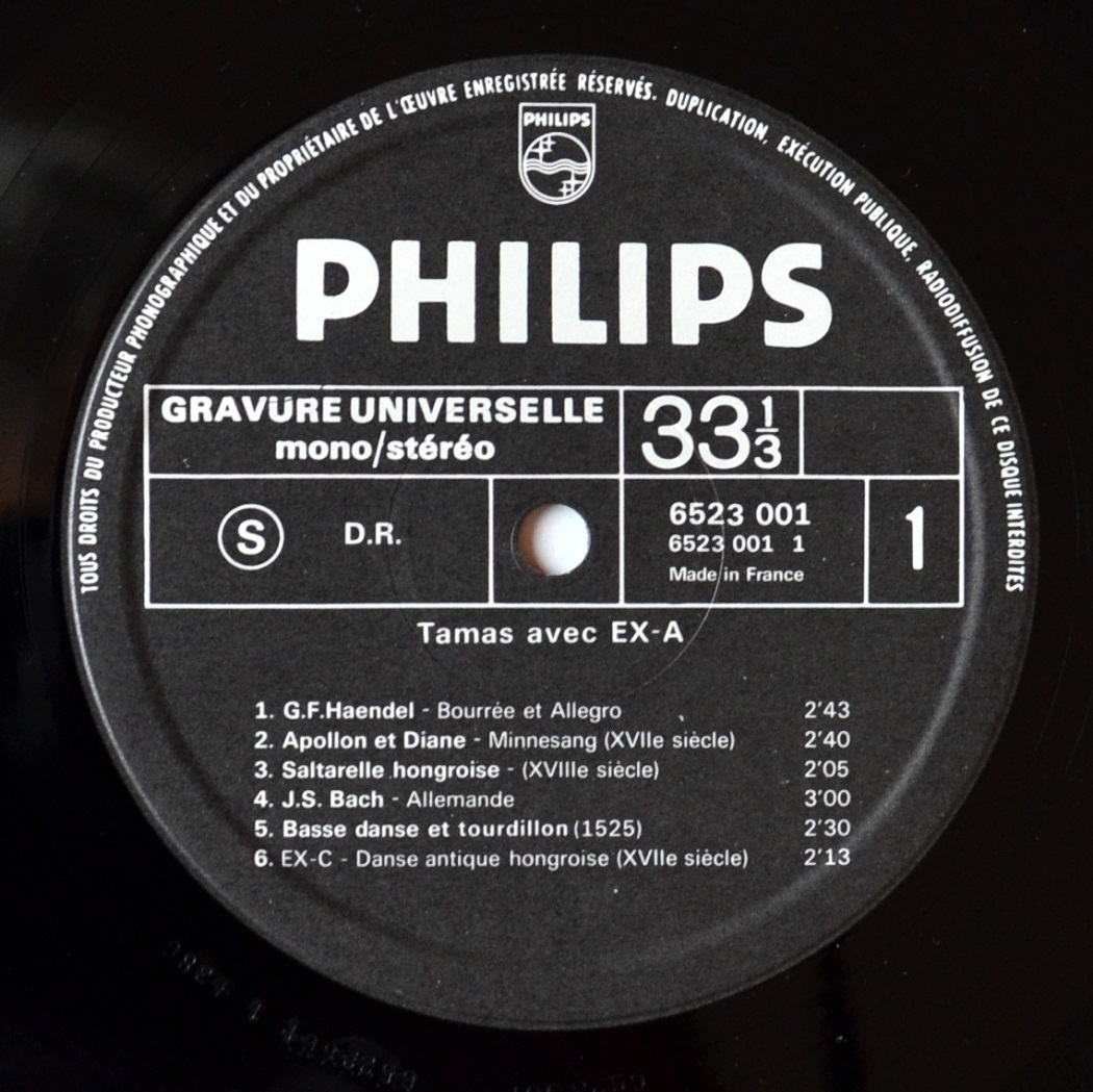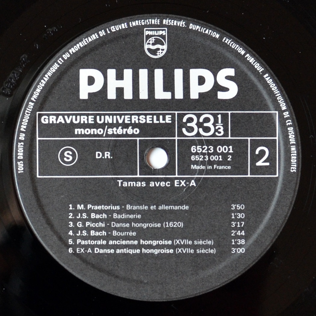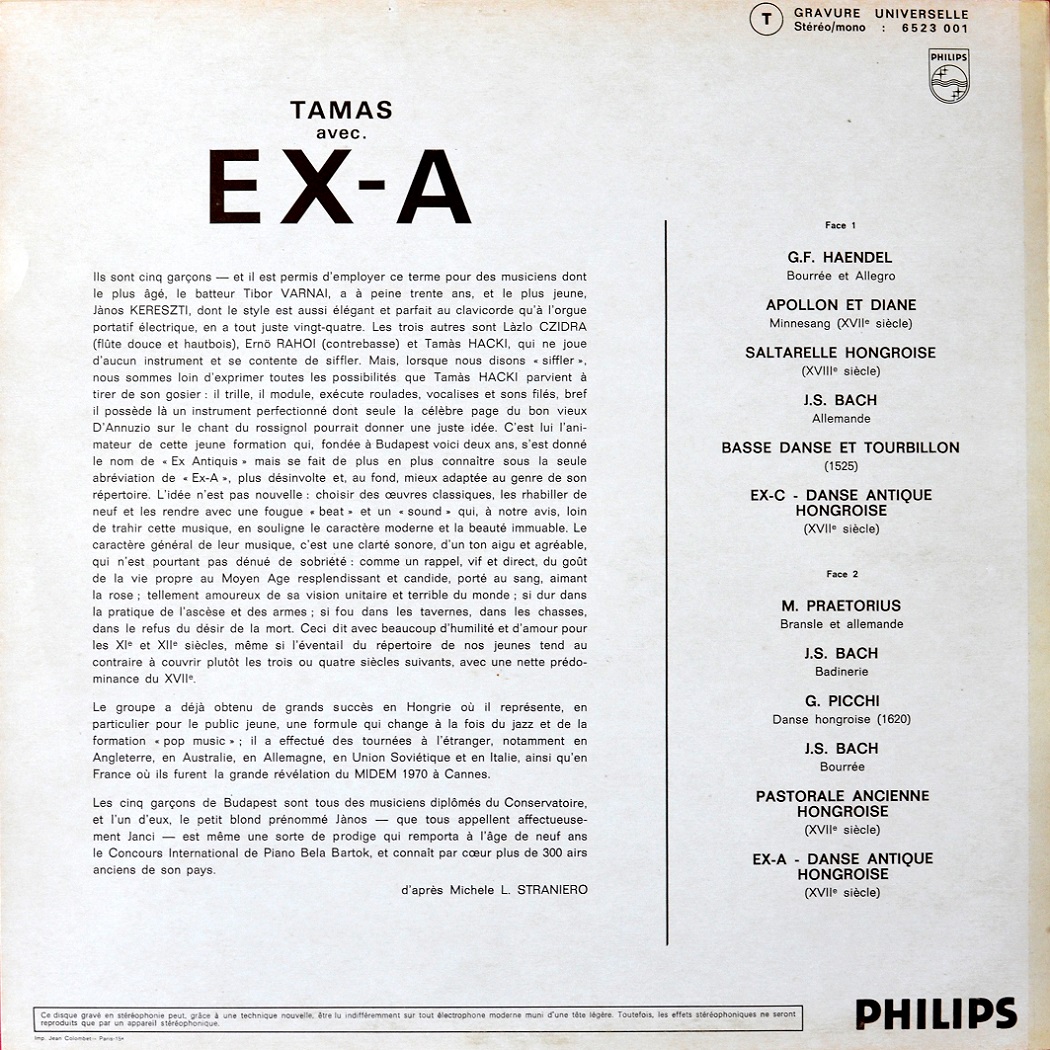 En janvier 1971, au Festival du Miidem à Cannes, l'ensemble hongrois Ex-Antiquis fait sensation. Philips France prend l'initiative la même année de publier l'album ci-dessous. Le titre Badinerie (suite in B minor) de JS Bach date de 1967. Bourrée de JS Bach (ou GF Handel???), Apollon et Diane, Hajdú táncok, Danse antique hongroise - EX-C et Danse antique hongroise EX-A ont été également édités chez Hungaroton en 1971. |
