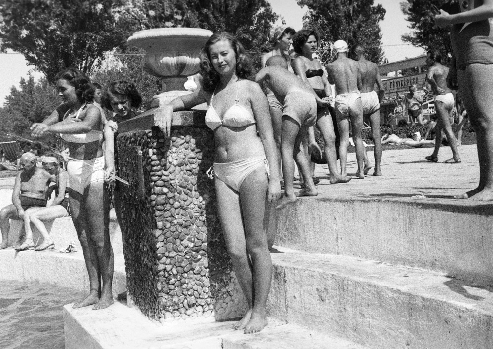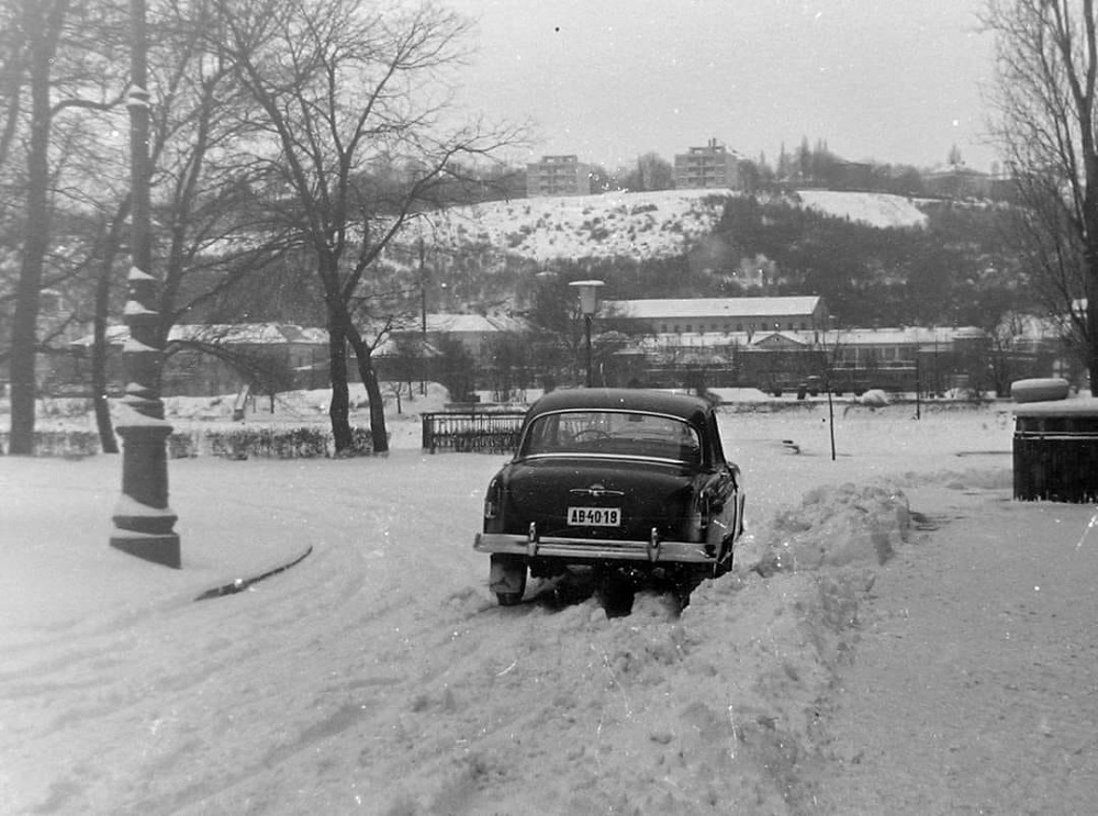 Margitsziget, Hajós Alfréd Nemzeti Sportuszoda előtt áll, egy Volga M 21 személygépkocsi (1959)